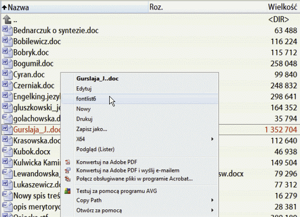 - FontList_6 Po zainstalowaniu FontList_6 program ten integruje się z Windows – dodaje możlwość szybkiego podglądu listy fontów zadeklarowanych i, co jest najistotniejsze, listy fontów osadzonych (embedded) w dokumentach WORD za pomocą menu kontekstowego po wciśnięciu RPM (prawego guzika myszki) gdy wskaźnik myszki znajduje się nad nazwą badanego dokumentu WORD.